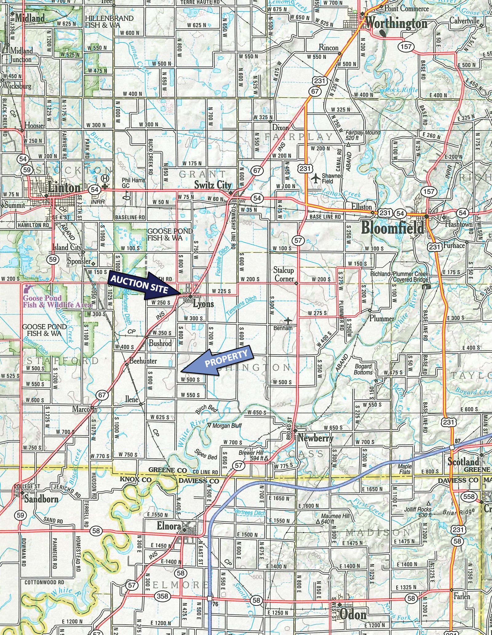 At the jct of Hwy 67 and Co Rd 800 W on the westside of Lyons, go South on 800 W 2.3 miles to the property.