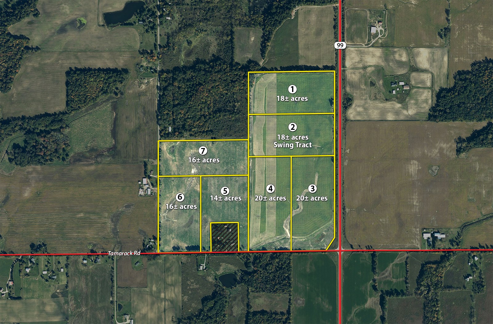 Tract 1: 18± ac mostly tillable with a small amount of wooded area in the NW corner. Recreational and homesite potential with frontage on M-99.