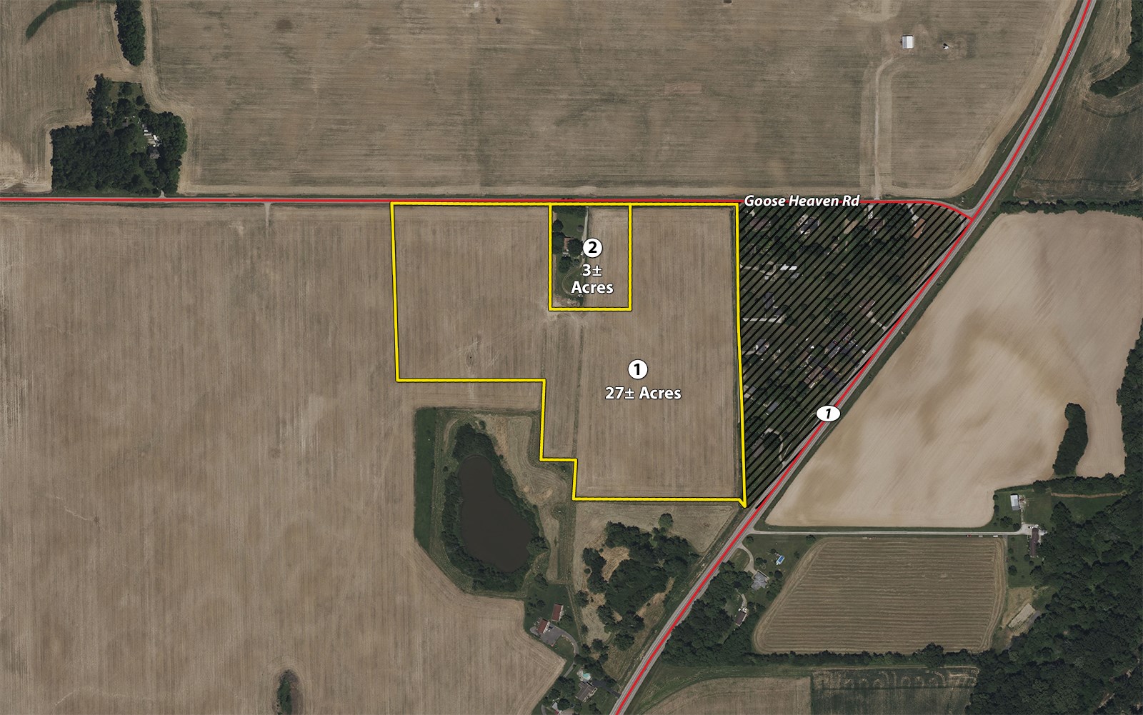 Tract 2: 3± ac With 1.5-Story Country Farmhouse located at 14661 Goose Heaven Rd. The home features 3 bedrooms and 2 full baths. Small acreage is very hard to find in the western Wayne County market.