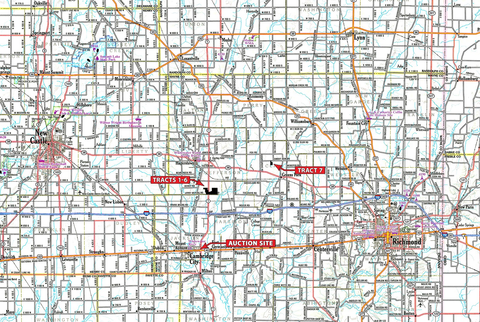 TRACTS 1-6: From the intersection of I-70 (Exit 137) and IN SR 1, travel North 1 mile to the farms on each side of SR 1. Intersection of Jerry Myers Rd / Fagan Rd and SR 1.