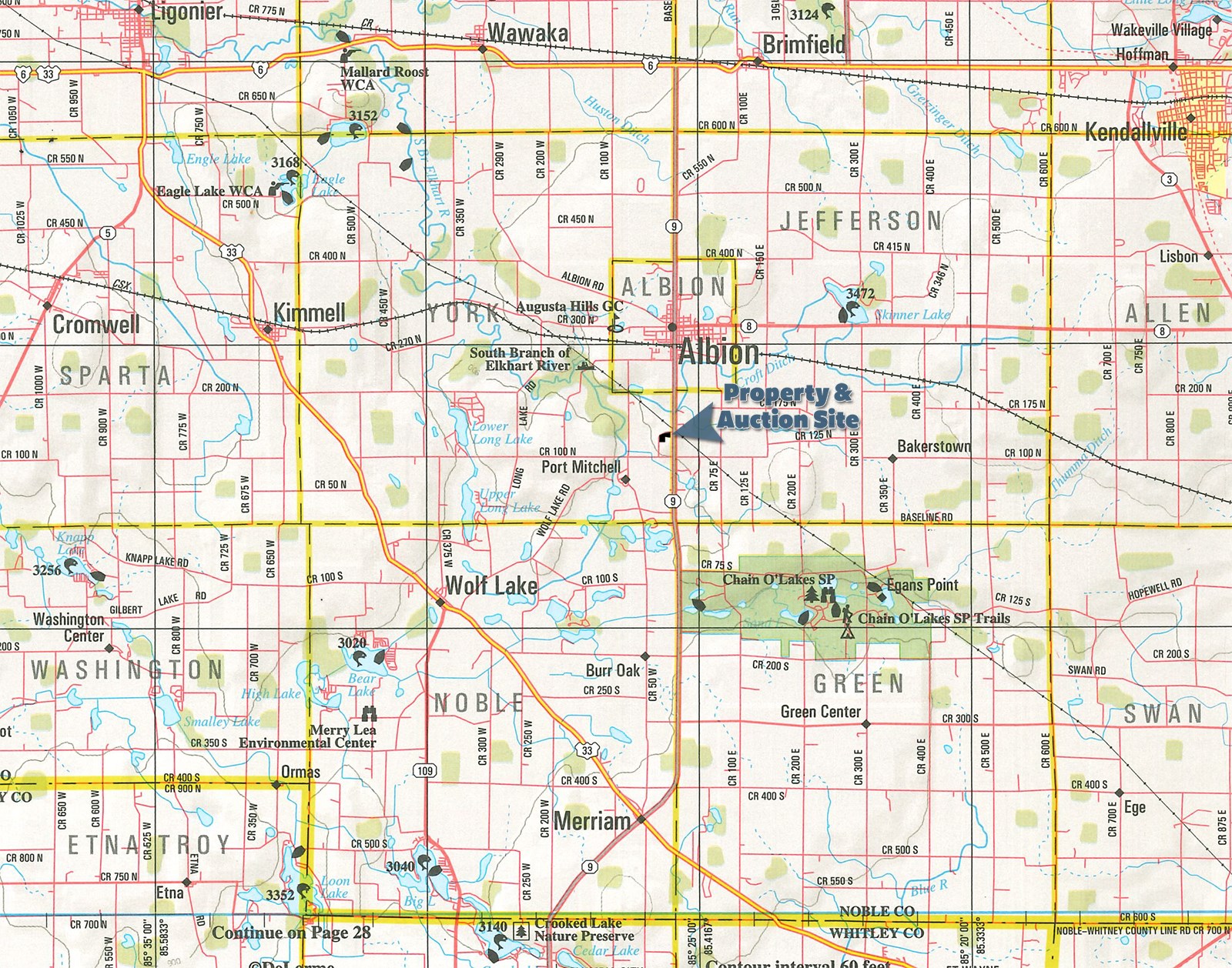 From the Intersection of SR 9 & SR 8 in downtown Albion, Drive south on SR 9 for 1.5 miles to CR 150 North. Turn right to Property, which sits on the South side of CR 150 North & the East side of North 25 West after a left curve in the road.